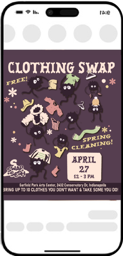 Swap Sesh is an ongoing project where I explore social media content creation to promote clothing swap events, while also inspiring sustainable consuming practices & mutual aid support in Indianapolis.